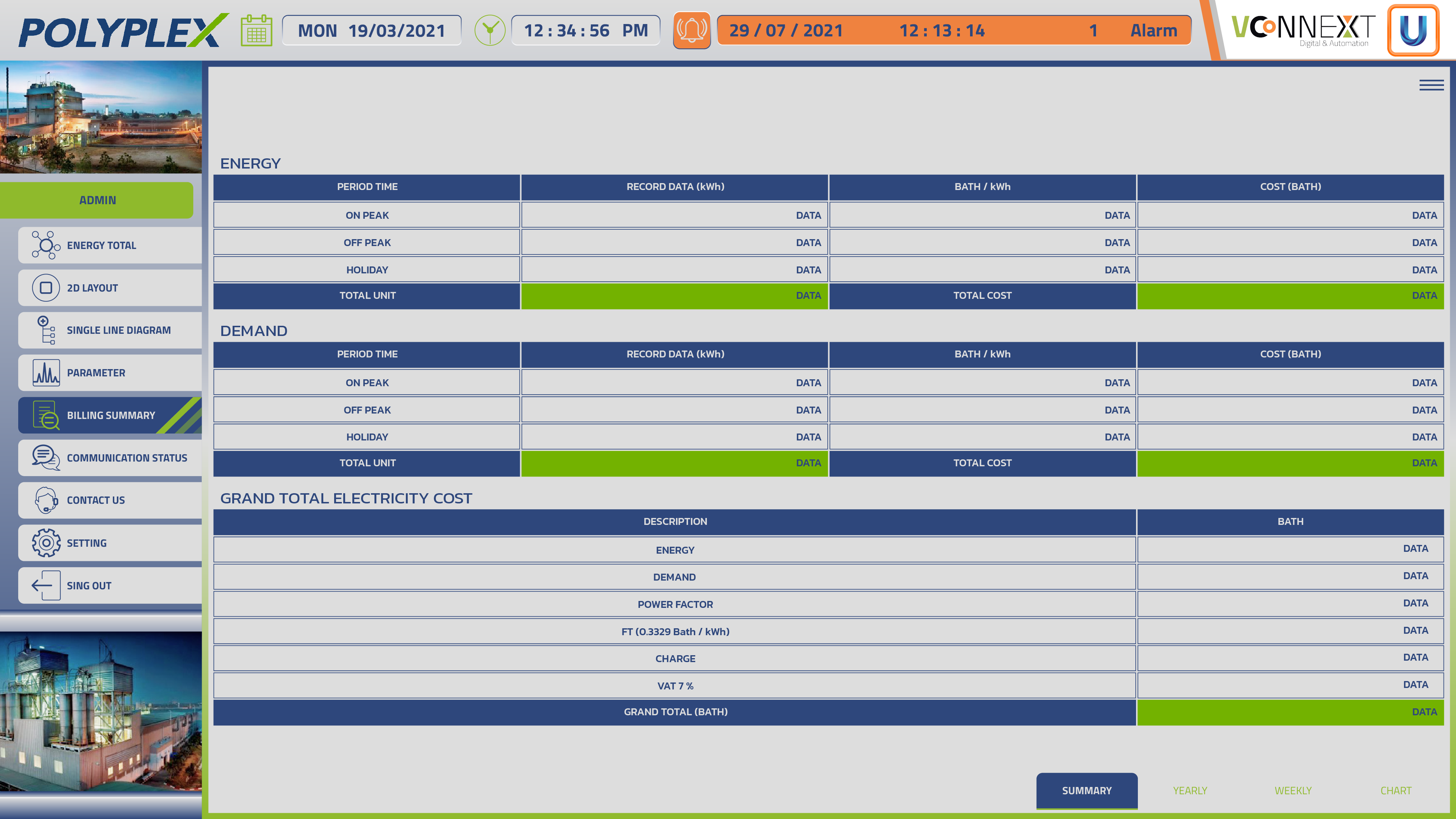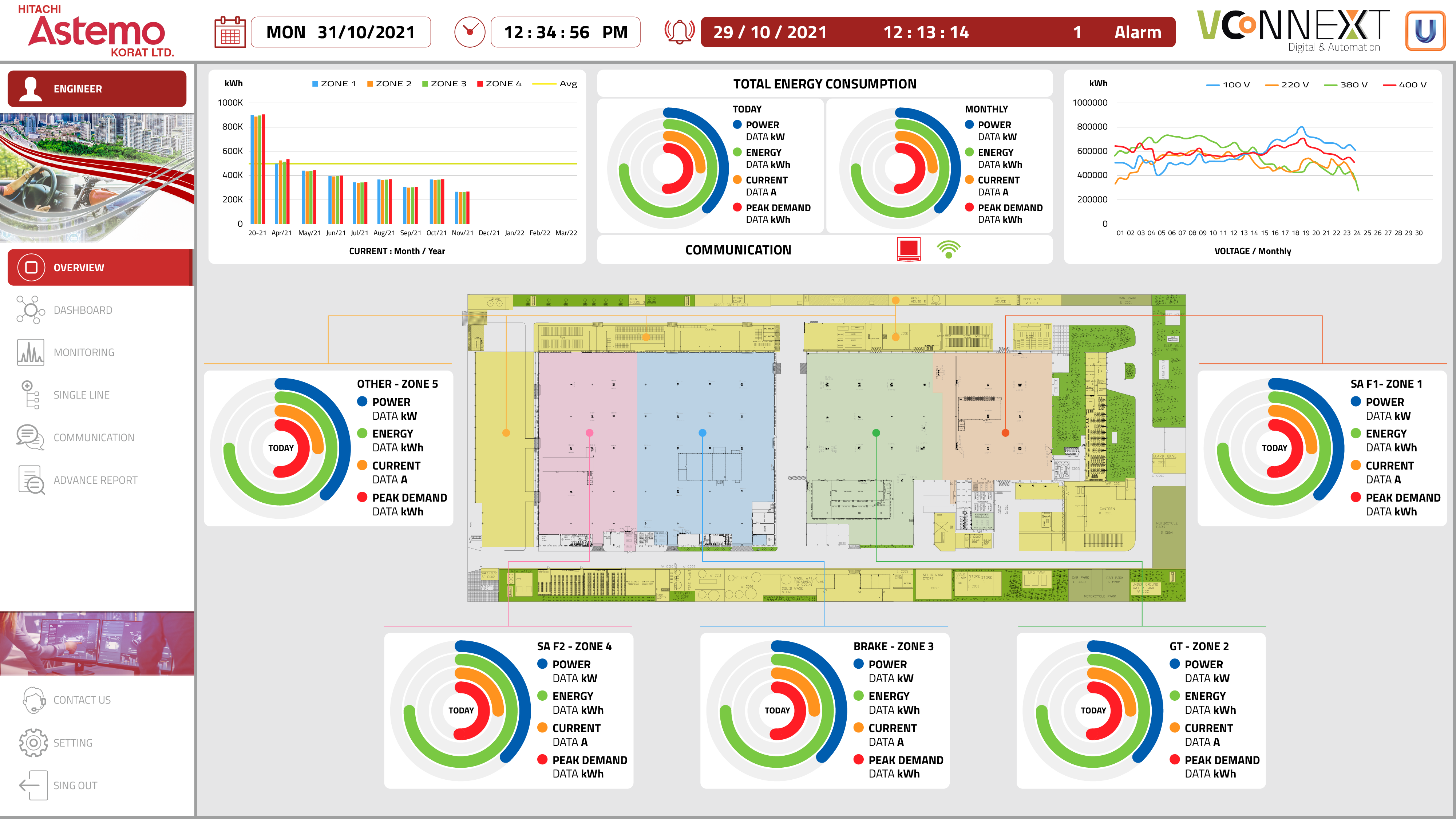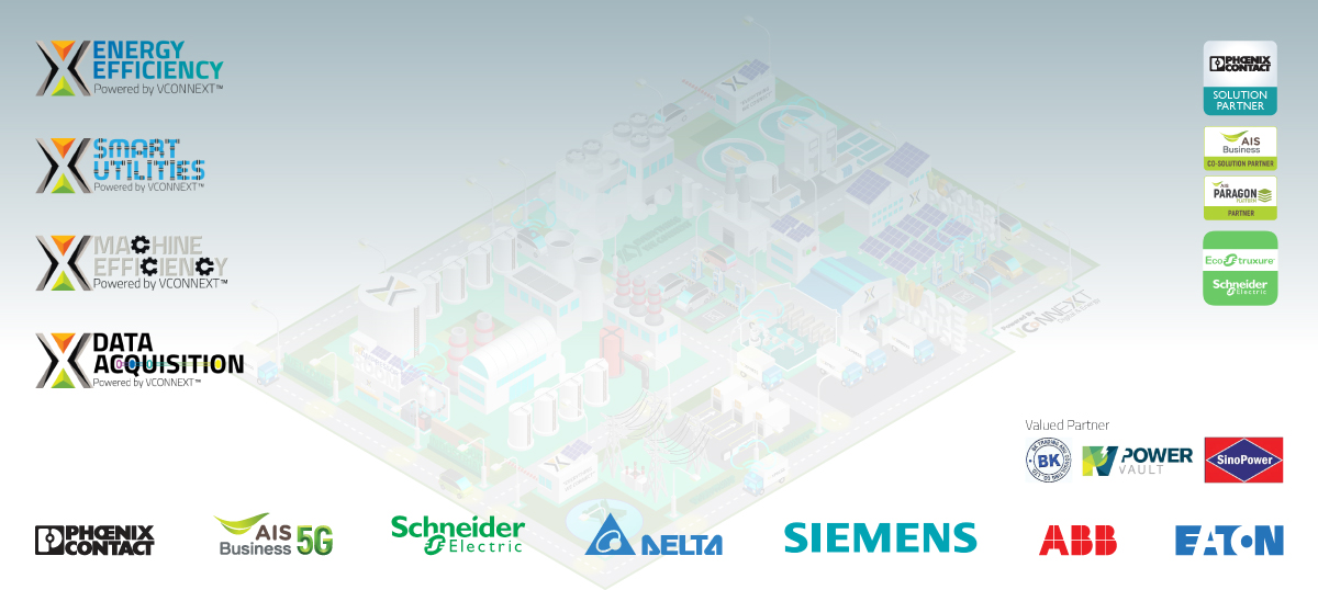 VCONNEXT helps to display data of energy usage in various forms such as water , electricity , gas , etc. Which can be seen and analyzed in real time , as well as able to calculate the energy cost per unit of production (Specific Energy Consumption : SEC) to be used to calculate KPI values.